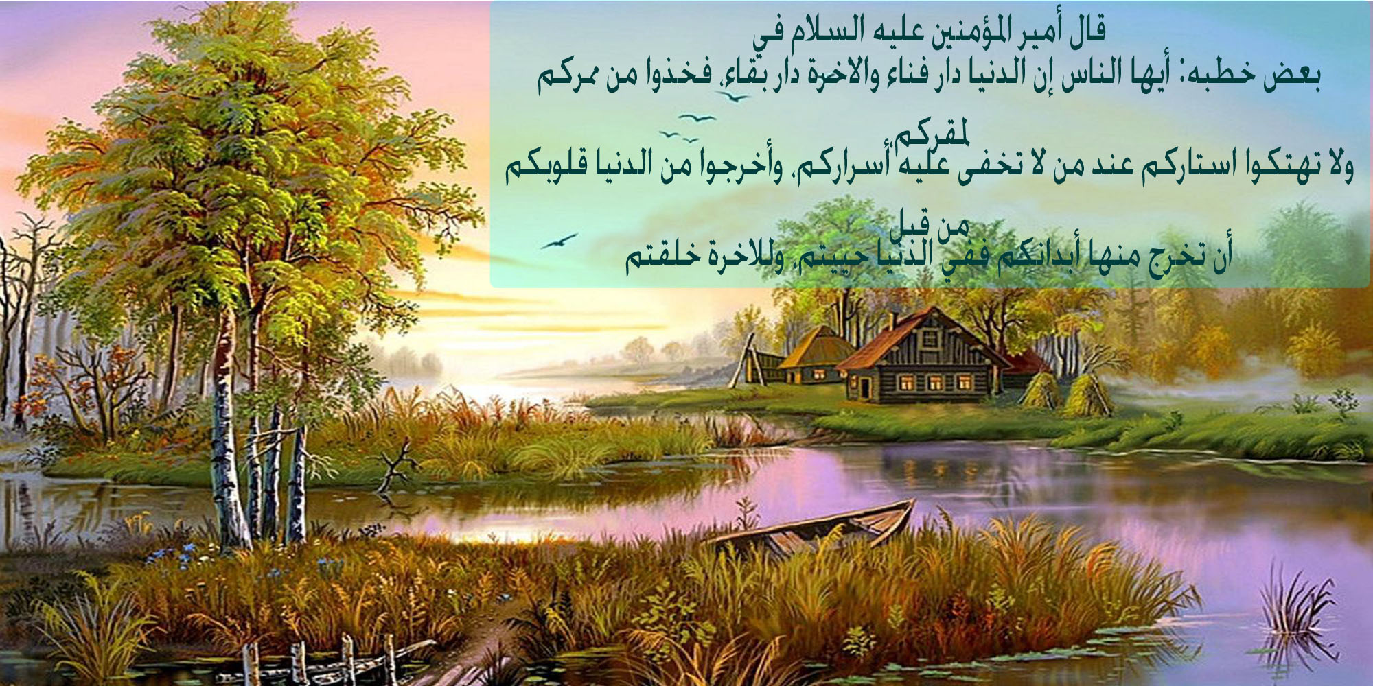 قال أمير المؤمنين عليه السلام في بعض خطبه: أيها الناس إن الدنيا دار فناء والاخرة دار بقاء، فخذوا من ممركم لمقركم، ولا تهتكوا استاركم عند من لا تخفى عليه أسراركم، وأخرجوا من الدنيا قلوبكم من قبل أن تخرج منها أبدانكم ففي الدنيا حييتم، وللاخرة خلقتم