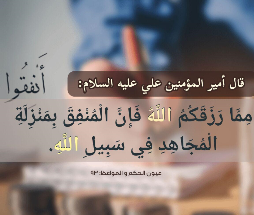 قال امير المؤمنين عليه السلام : انفقوا مما رزقكم الله ، فان المنفق بمنزلة المجاهد في سبيل الله . (عيون الحكم والمواعظ)