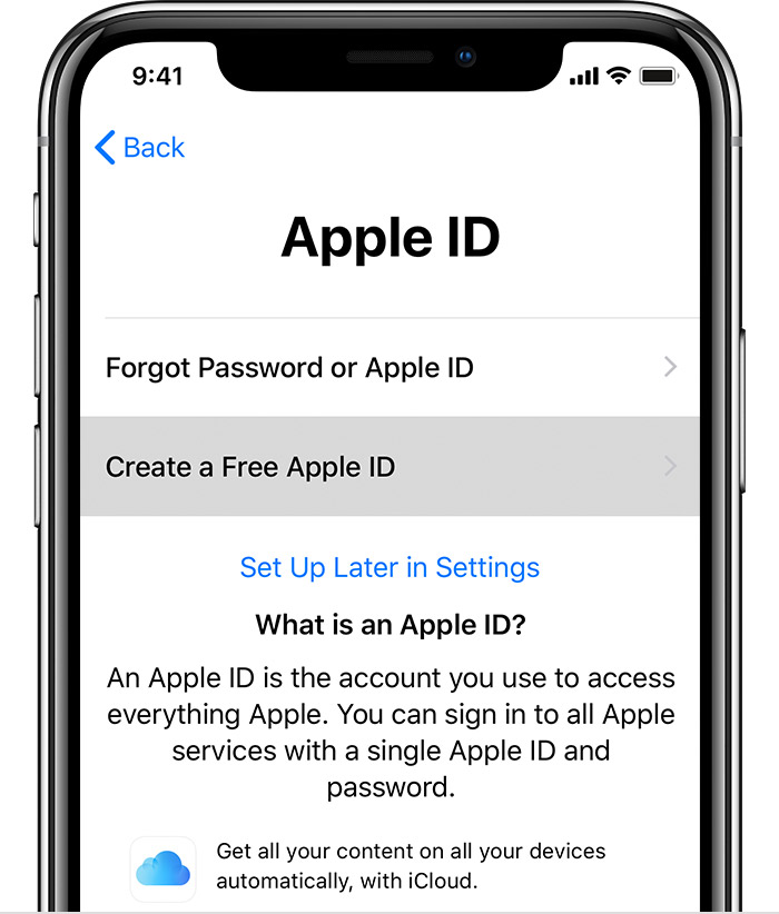 1) Go to the settings app. 2) Tap Create a free Apple ID. 3) Enter a birth date. 4) Enter your first & last name. 5) Use your current email address or get a new iCloud account & enter your email address. 6) Create a password. 7) Verify the password. 8) Select 2 security questions. 9) Agree to the Terms & Conditions.Tap Merge or Don't Merge to sync iCloud data. 10) Tap OK to confirm Find My iPhone is turned on.