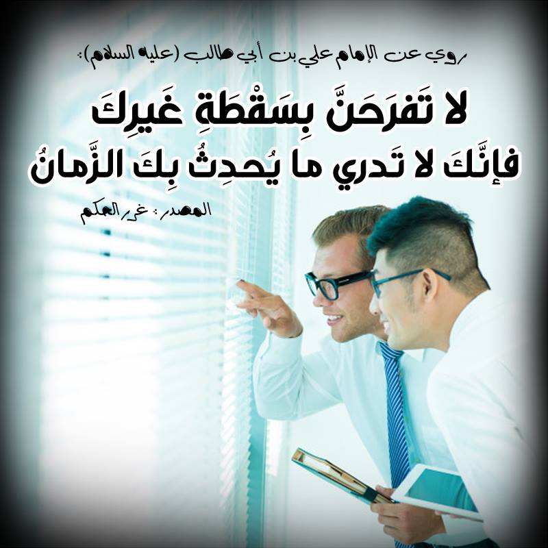 الإمام عَلِيِّ بْنِ أَبِي طَالِبٍ ( عليه السَّلام ) أنهُ قَالَ : لا تَفرَحَنَّ بِسَقْطَةِ غَيرِكَ ؛ فإنَّكَ لا تَدري ما يُحدِثُ بِكَ الزَّمانُ .