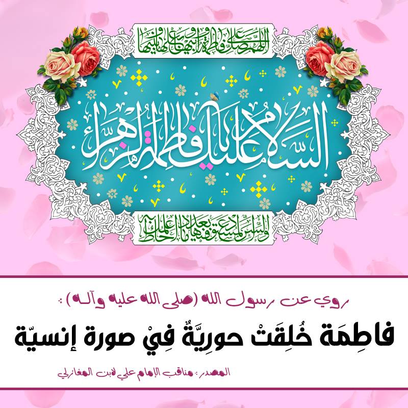 رسول الله ( صلى الله عليه و آله ) أنهُ قَالَ : فاطِمَة خُلِقَتْ حورِيَّةٌ فِيْ صورة إنسيّة .