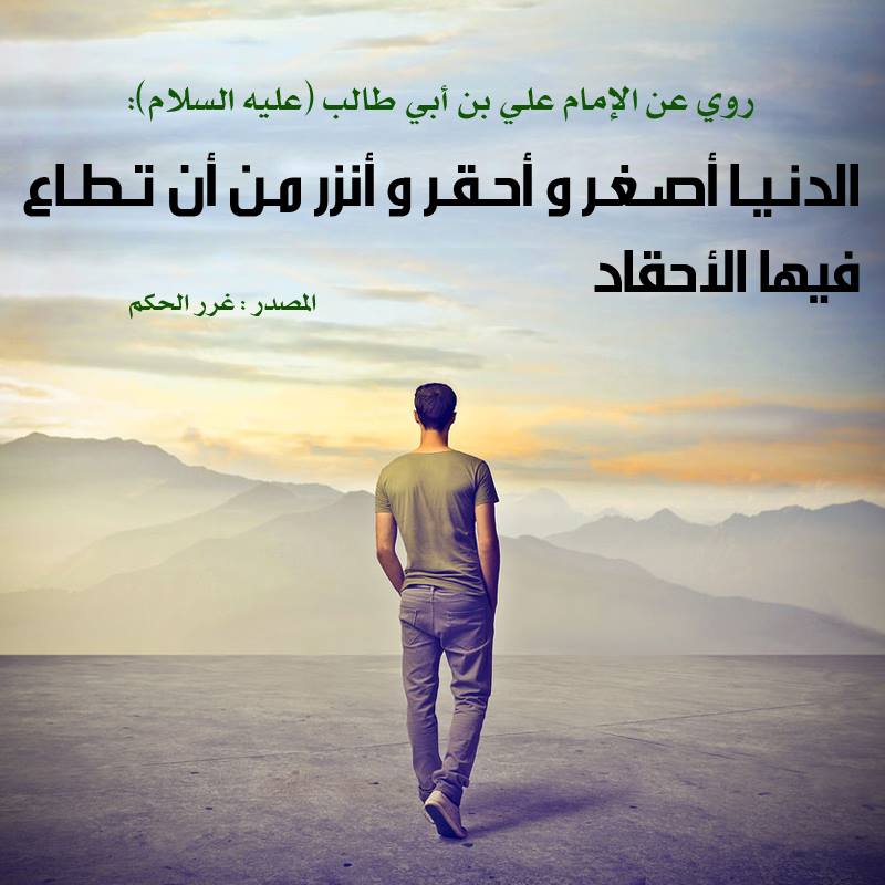 الإمام عَلِيِّ بْنِ أَبِي طَالِبٍ ( عليه السَّلام ) أنهُ قَالَ : الدُّنيا أصْغَرُ و أحْقَرُ و أنْزرُ مِن أنْ تُطاعَ فيها الأحْقادُ .