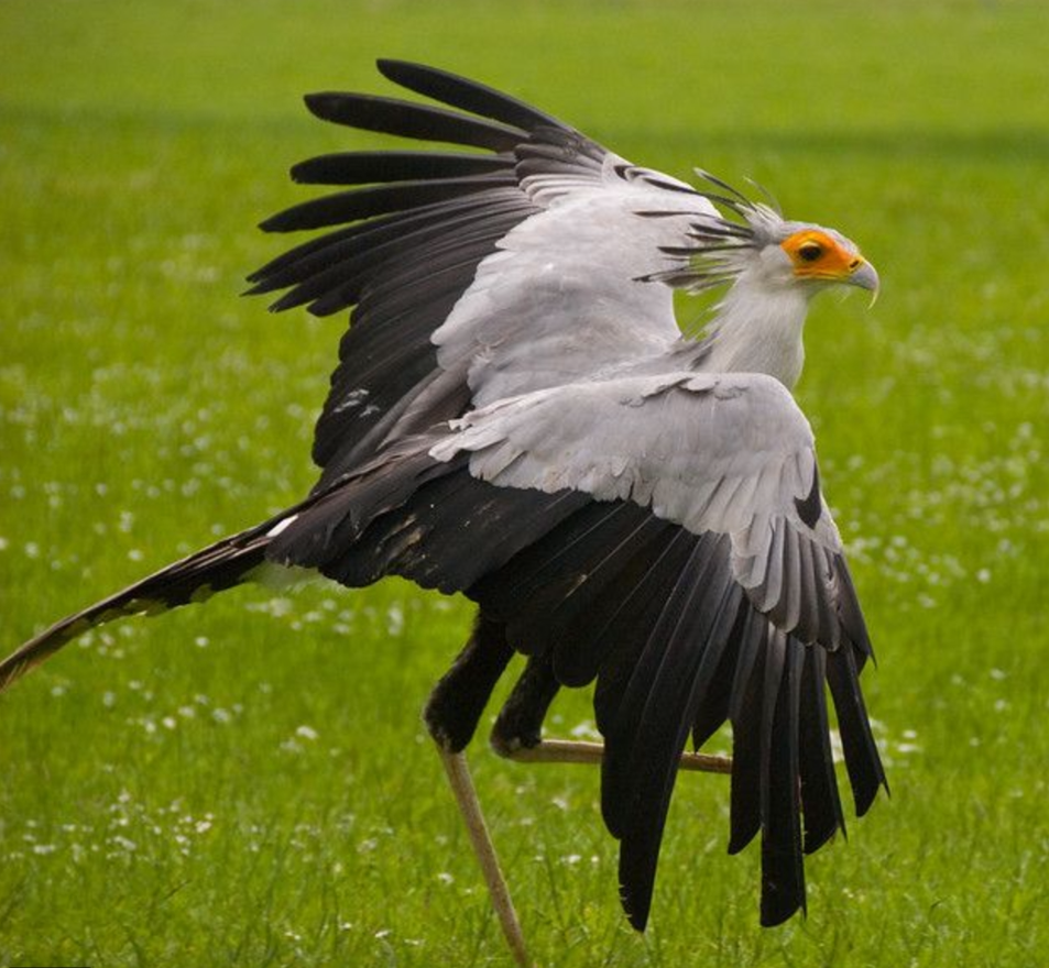 يعيش هذا الطائر في القارة الافريقية وهو نوع من الطيور الجارحة (النسور)، له ساقان طويلتان أشبه بسيقان الكركي وجسمه مثل جسم الصقور وله ذنباً طويلاً يغلب عليه اللون الأسود، ويغطي الجزء العلوي من ساقيه ريش ناعم أسود اللون حتى الركبة، وتنتهي الساق بمخالب قوية.ويسود المنطقة التي بين عينيه وجهه لون برتقالي مائل إلى الحمرة وينتهي وجهه بمنقار معقوف الشكل حاد. ولون ريش جناحيه أسود ورصاصي (رمادي) يقتات الطائر إلى جانب الجديان والغزلان الصغيرة من صيد الثديات الصغيرة…