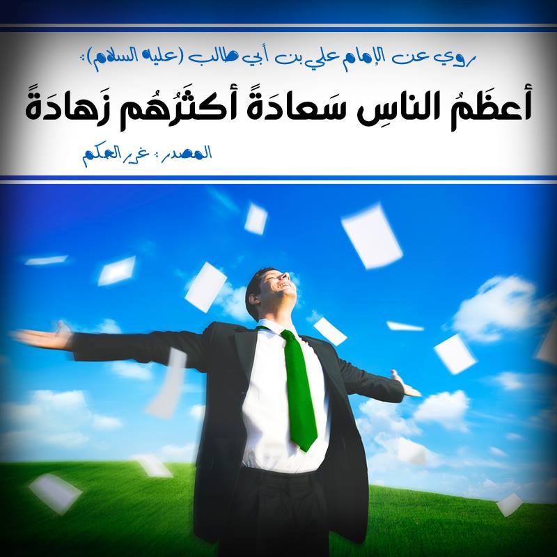 الإمام عَلِيِّ بْنِ أَبِي طَالِبٍ ( عليه السَّلام ) أنهُ قَالَ : أعظَمُ الناسِ سَعادَةً أكثَرُهُم زَهادَةً .