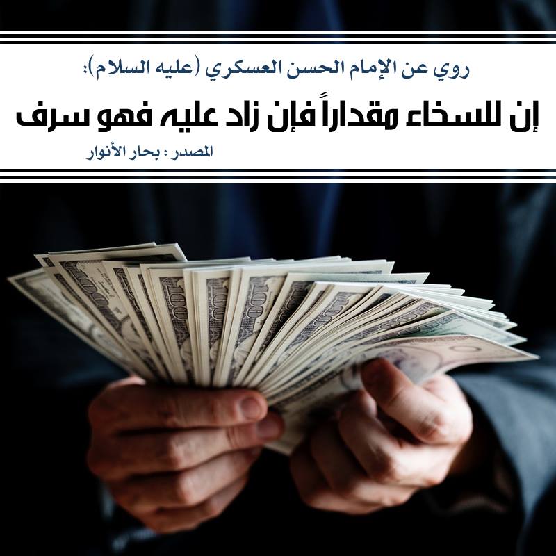 الإمام الحسن بن علي العسكري ( عليه السلام ) أنهُ قَالَ : إنّ للسَّخاءِ مِقدارا فإنْ زادَ علَيهِ فهُو سَرَفٌ .
