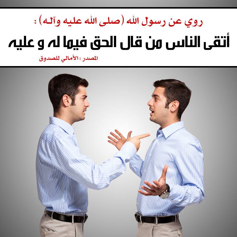 رسول الله ( صلى الله عليه و آله ) أنهُ قَالَ : أتْقى النّاسِ مَن قالَ الحقَّ فيما لَهُ و عَلَيهِ .