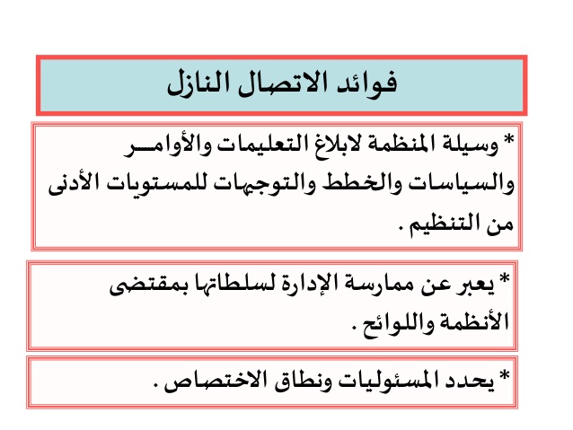 الاتصال النازل: وهو الاتصال الذي يتم بين الادارة العليا واعضاء الادارة الوسطى وبين موظفي الادارة المباشرة او المشرفين وصولا الى العاملين في مستوى التنفيذ وهكذا يتم الاتصال على شكل تعليمات واوامر او توجيهات وسياسات تصدرها الهيئة العليا بغرض تنظيم او توجيه الاعمال.