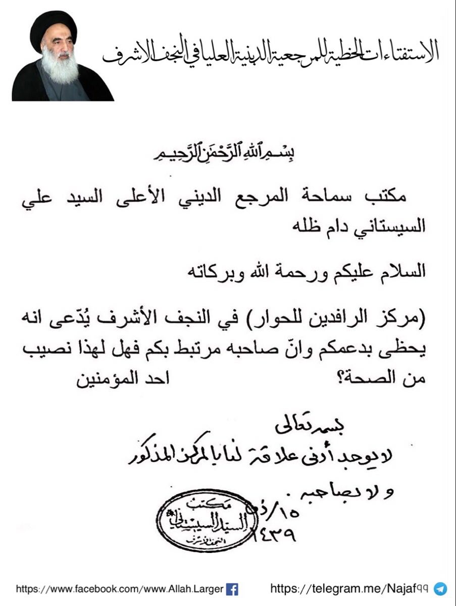 مكتب سماحة السيد السيستاني ( دام ظله ) يفند دعوى ارتباط ( مركز الرافدين للحوار ) به وكذلك صاحبه .