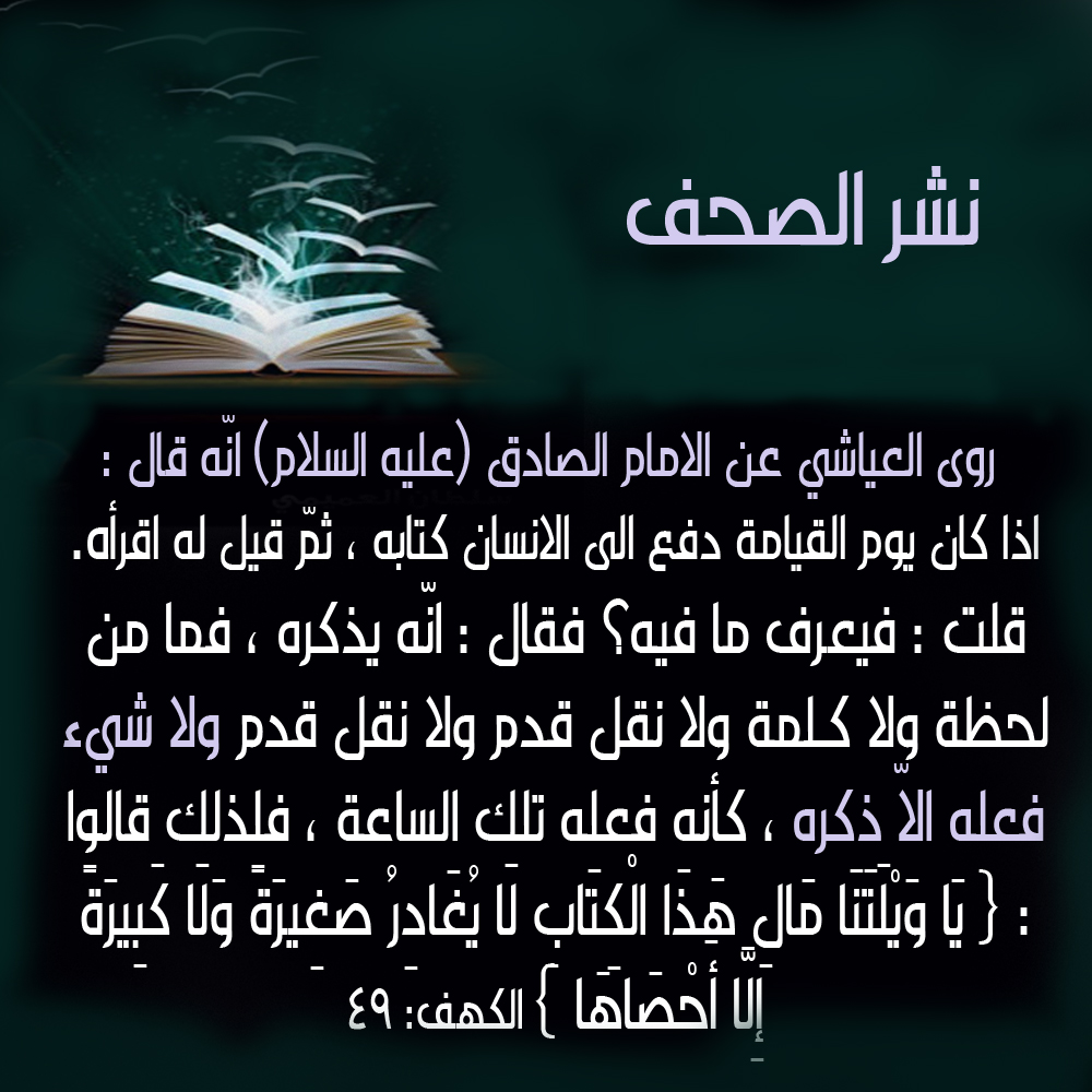 نشر الصحف : روي عن الإمام الصادق عليه السلام أنَّه قال: "إذا كان يوم القيامة دُفع إلى الإنسان كتابه، ثمّ قيل له: اقرأه. قيل: فيعرف ما فيه؟، فقال عليه السلام: إنََّه يذكره، فما من لحظة ولا كلمة ولا نقلِِ قدم ولا شيء فعله إلا ذكره، كأنَّه فعله تلك الساعة، فلذلك قالوا: ﴿يَا وَيْلَتَنَا مَالِ هَذَا الْكِتَابِ لَا يُغَادِرُ صَغِيرَةً وَلَا كَبِيرَةً إِلَّا أَحْصَاهَا﴾(الكهف:49).