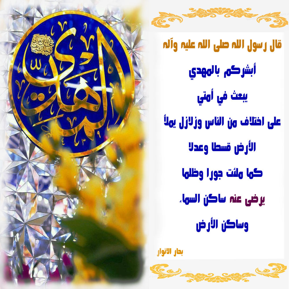 عن أبي سعيد الخدري قال: قال رسول الله صلى الله عليه وآله: أبشركم بالمهدي يبعث في أمتي على اختلاف من الناس وزلازل فيملأ الأرض عدلا وقسطا كما ملئت ظلما وجورا يرضى عنه ساكن السماء وساكن الأرض ... [بحار الانوار]