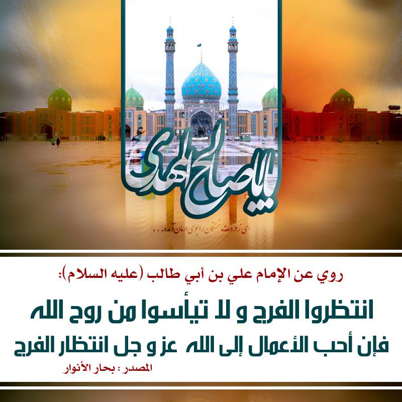رُوِيَ عَنْ الإمام عَلِيِّ بْنِ أَبِي طَالِبٍ ( عليه السَّلام ) أنهُ قَالَ : انتظِروا الفرَجَ و لا تَيأسُوا مِن رَوحِ اللّه ِ، فإنّ أحبَّ الأعمالِ إلى اللّه ِ عزّ و جلّ انتظارُ الفَرَجِ .