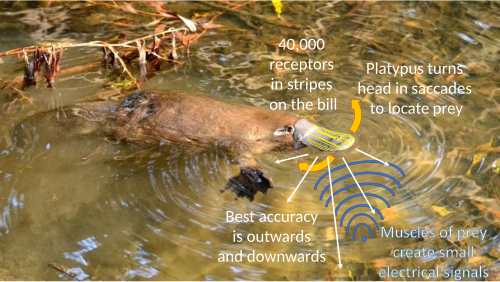 These detect tiny, underwater bursts of electricity from the muscles of swimming creatures that the platypus hunts. The electroreceptors are intermingled with 60,000 mechanoreceptors, nerves ending at the skin in tiny "push rods" that respond to small pressure changes and detect the movements of prey animals underwater and on the bottoms of streams and ponds. Together, the two senses allow the platypus to home in on prey.