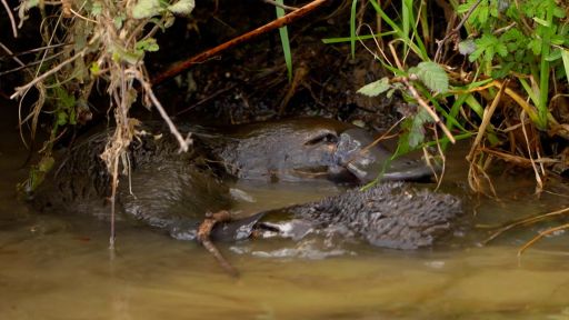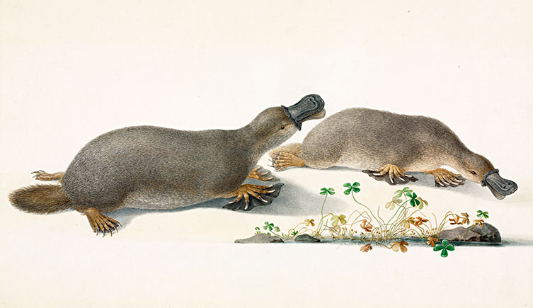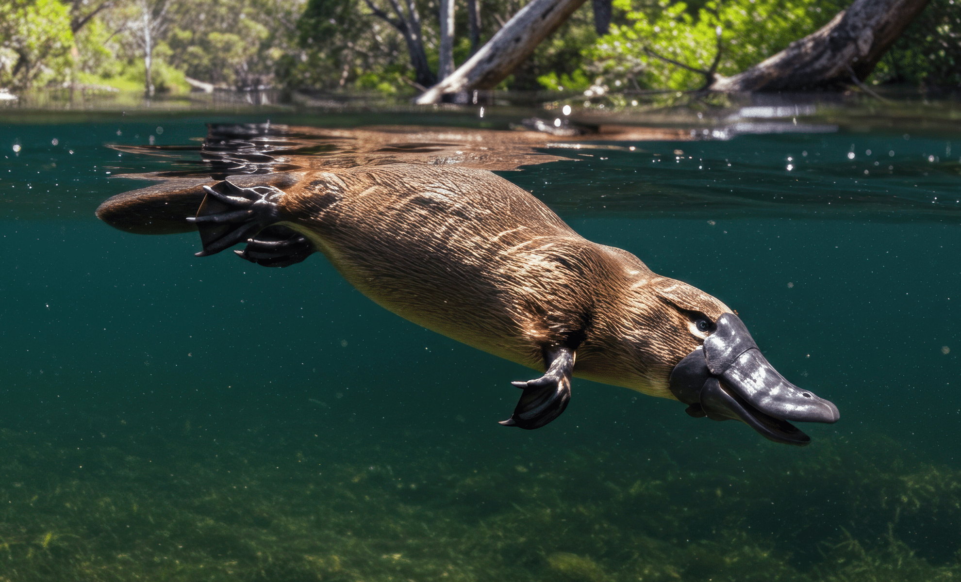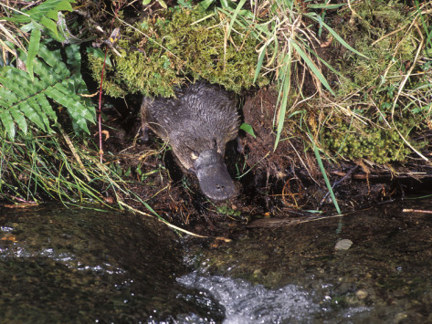 The platypus feeds by snagging swimming creatures with its bill and by rousting them out of stream bottom mud and gravel, shoveling it up with its bill to put buried creatures to flight, then catching them as they try to escape.