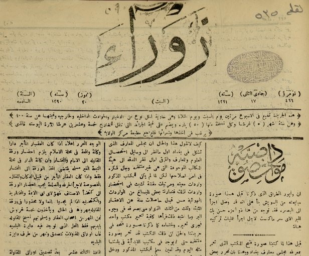 الزوراء: هي اول جريدة تصدر في العراق عام 1869 والتي أسسها الوالي العثماني مدحت باشا والتي جلب اليها مطبعة من باريس وسماها مطبعة (الولاية) وكانت اول مطبعة بخارية تدخل العراق.