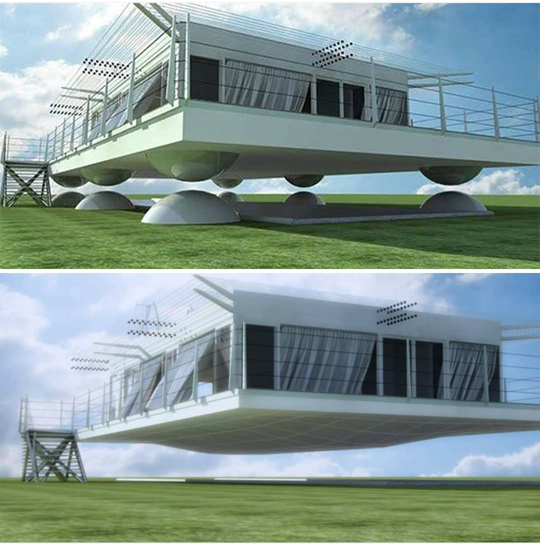 وذلك عن طريق مستشعر اسفل المبنى يقوم بضغط الهواء لتصبح عائمة ( طائره في الهواء)