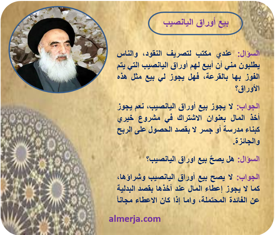 الجواب: لا يجوز بيع أوراق اليانصيب ، نعم يجوز أخذ المال بعنوان الاشتراك في مشروع خيري كبناء مدرسة أو جسر لا بقصد الحصول على الربح والجائزة .