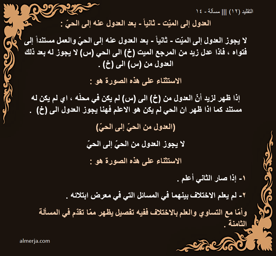 لا يجوز العدول إلى الميّت - ثانياً - بعد العدول عنه إلى الحيّ والعمل مستنداً إلى فتواه ، فاذا عدل زيد من المرجع الميت (خ) الى الحي (س) لا يجوز له بعد ذلك العدول من (س) الى (خ) .