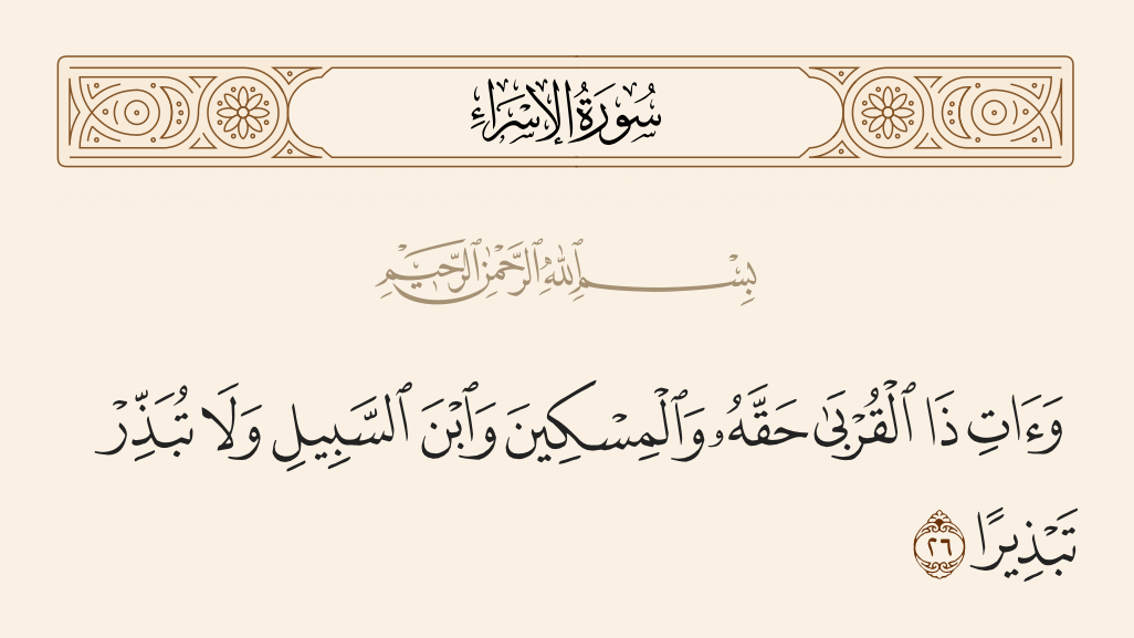 الخمس 21 : قوله تعالى : {وَآتِ ذَا الْقُرْبَى حَقَّهُ } [الإسراء: 26] يدل على الخمس ، حيث ان من اهم حقوق ذوي القربى الخمس ، والمقصود بذوي القربى هو قربى الرسول صلى الله عليه واله .