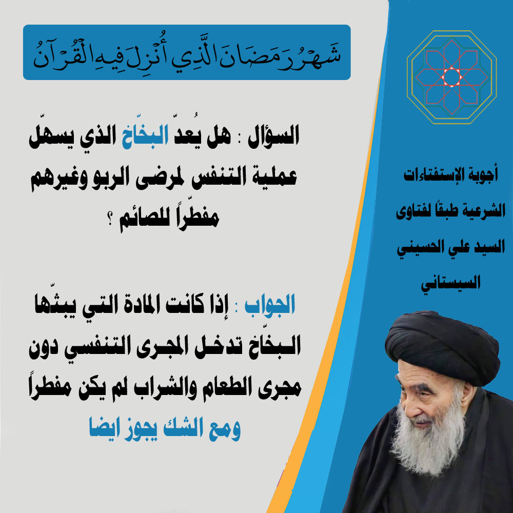 الجواب : إذا كانت المادة التي يبثّها الـبخّاخ تدخـل المجـرى التنفسي دون مجرى الطعام والشراب لم يكن مفطراً ومع الشك يجوز ايضا