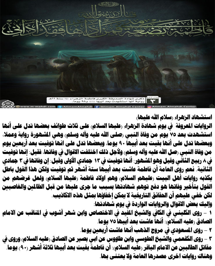 امير المؤمنين يصف حزنه على الزهراء لعمار: ياعماران العزاء عن مثل من فقدته لعزيزاني فقدت رسول الله(ص)بفقد فاطمة، انها كانت لي عزاء وسلوة وكانت إذا نطقت ملأت سمعي بصوت الرسول (ص)،واذا مشت لم تخرم مشيته وأني ما أحسست تألم الفراق إلا بفراقها وإن اعظم مالقيت من مصيبتها(اني لماوضعتها على المغتسل وجدت ضلعا من أضلاعها مكسورا وجنبها قد اسود من ضرب السياط)وكانت تخفي ذلك علي مخافة ان يشتد حزني وما نظرت عيناي الى الحسن والحسين الا وخنقتني العبرة وما نظرت الى زينب باكية الا واخذتني الرقة عليها.