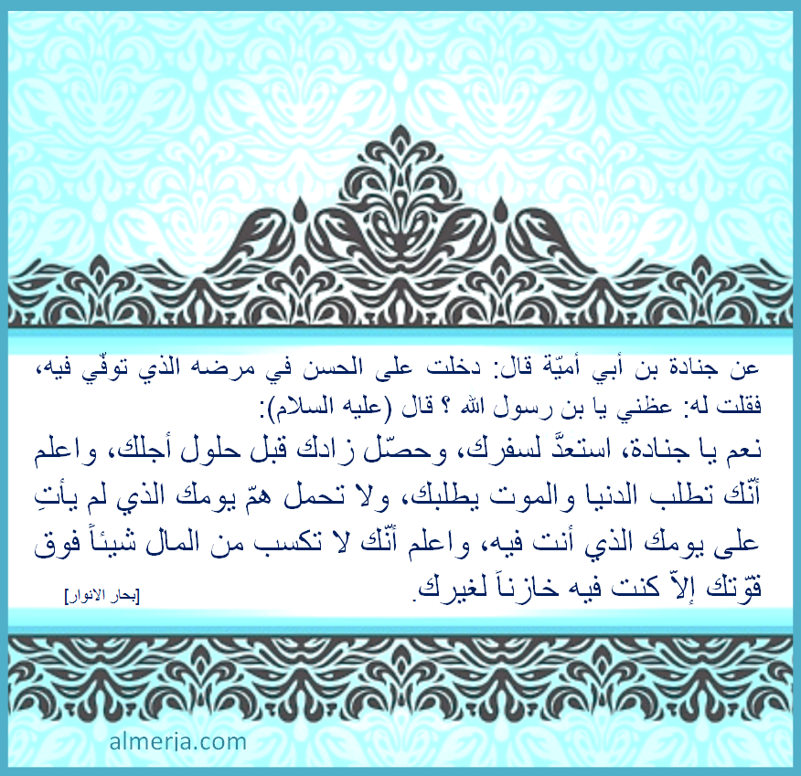 نعم يا جنادة، استعدَّ لسفرك، وحصّل زادك قبل حلول أجلك، واعلم أنّك تطلب الدنيا والموت يطلبك، ولا تحمل همّ يومك الذي لم يأتِ على يومك الذي أنت فيه، واعلم أنّك لا تكسب من المال شيئاً فوق قوّتك إلاّ كنت فيه خازناً لغيرك. [بحار الانوار]