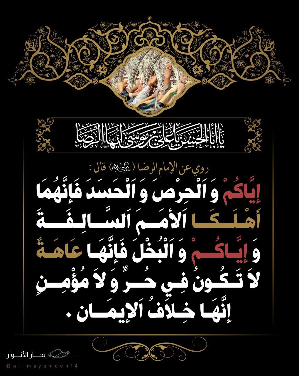إياكم والحرص والحسد فإنهما أهلكا الأمم السالفة وإياكم والبخل فإنهما عاهة لا تكون في حُر ولا مؤمن إنها خلافُ الإيمان .