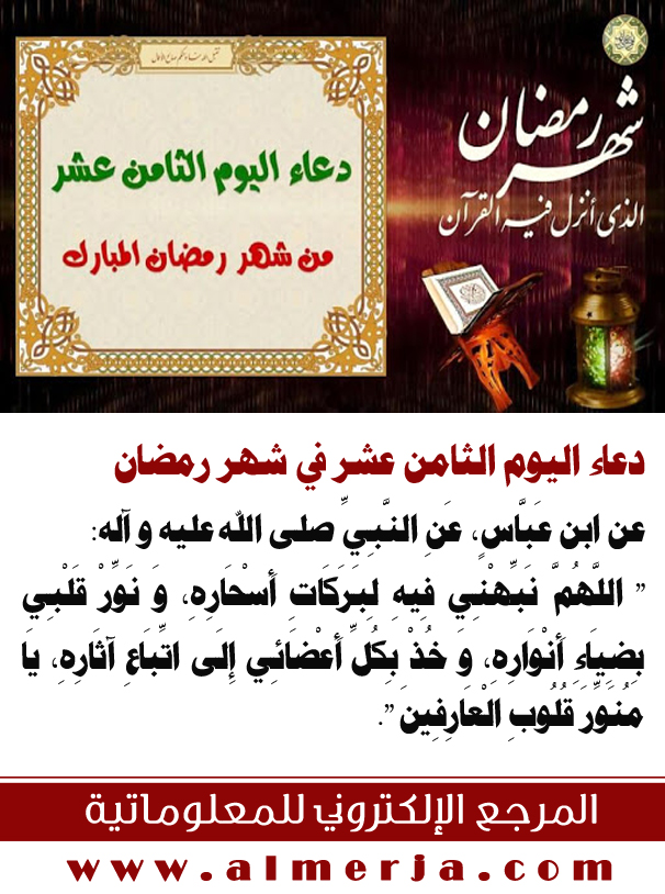 دعاء اليوم الثامن عشر من شهر رمضان/ "عن ابن عَبَّاسٍ، عَنِ النَّبِيِّ صلى الله عليه وآله: