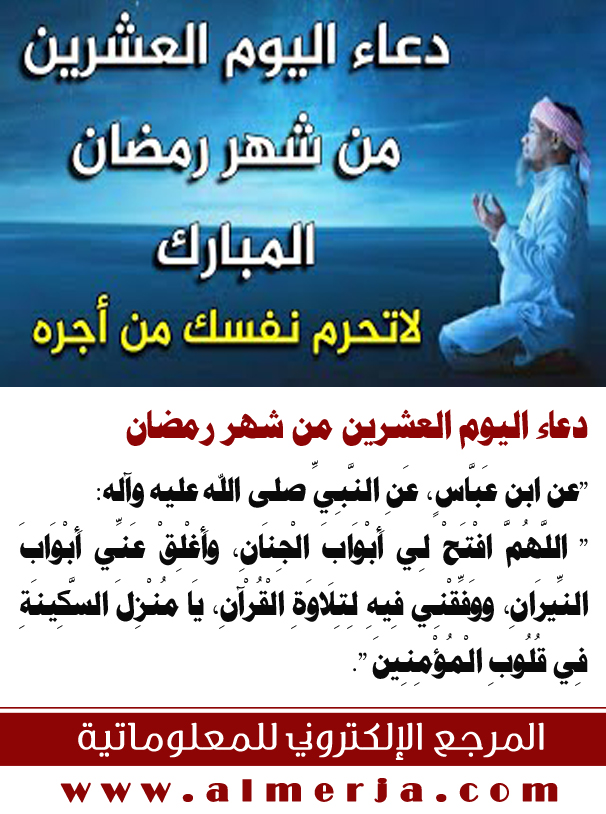 دعاء اليوم العشرين من شهر رمضان /عن ابن عَبَّاسٍ، عَنِ النَّبِيِّ صلى الله عليه وآله:اللَّهُمَّ افْتَحْ لِي أَبْوَابَ الْجِنَانِ، وأَغْلِقْ عَنِّي أَبْوَابَ النِّيرَانِ، ووَفِّقْنِي فِيهِ لِتِلَاوَةِ الْقُرْآنِ، يَا مُنْزِلَ السَّكِينَةِ فِي قُلُوبِ الْمُؤْمِنِينَ ..قيل مَنْ دَعَا بِهِ بَعَثَ اللَّهُ إِلَيْهِ أَلْفَ أَلْفِ مَلَكٍ يَحْفَظُونَهُ مِنْ كُلِّ جَبَّارٍ وشَيْطَانٍ وسُلْطَانٍ، وكَتَبَ لَهُ بِكُلِّ مَنْ صَامَ شَهْرَ رَمَضَانَ سِتِّينَ سَنَةً مَقْبُولَةً ..... .