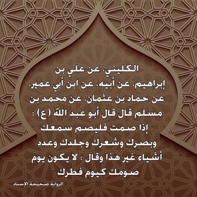 عن أبي عبدالله (عليه السلام) قال: إن الصيام ليس من الطعام والشراب وحده، ثم قال: قالت مريم: (إني نذرت للرحمن صوما) (1) أي صوما وصمتا ـ وفي نسخة اخرى: أي صمتا ـ فاذا صمتم فاحفظوا ألسنتكم، وغضوا أبصاركم، ولا تنازعوا، سمع رسول الله (صلى الله عليه وآله وسلم) امرأة تسب جارية لها وهي صائمة، فدعا رسول الله (صلى الله عليه وآله وسلم) بطعام، فقال لها: كلي، فقالت: إني صائمة، فقال: كيف تكونين صائمة وقد سببت جاريتك، ان الصوم ليس من الطعام والشراب فقط.(وسائل الشيعة - الحر العاملي )