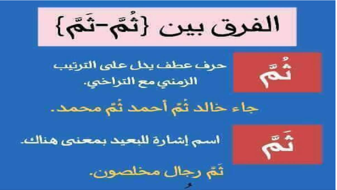 ثُمّ بضمّ الثاء هي حرف عطف تفيد الترتيب والتراخي كما في قوله تعالى في سورة الكهف (قَالَ لَهُ صَاحِبُهُ وَهُوَ يُحَاوِرُهُ أَكَفَرْتَ بِالَّذِي خَلَقَكَ مِن تُرَابٍ ثُمَّ مِن نُّطْفَةٍ ثُمَّ سَوَّاكَ رَجُلاً {37}). أما ثم بفتح الثاء تأتي بمعنى هناك(وإذا رأيت ثم رأيت نعيما وملكا كبيرا(20)) الإنسان.