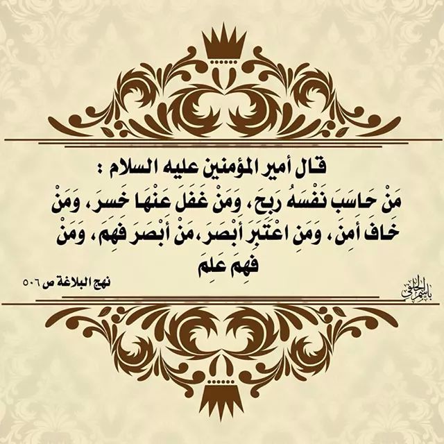 قال الإمام علي عليه السلام : (من حاسبَ نفسَه ربح ، ومن غفَل عنها خسر) نهج البلاغة ، شرح الفيض الأصفهاني ص1170.