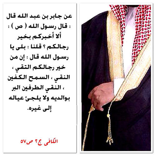 عن النبي الأعظم صلى الله عليه وآله قوله: (ألا أخبركم بخيار رجالكم؟ قلنا: بلى يا رسول الله ، قال: إنّ من خير رجالكم: التقي، النقي، السمح الكفين، السليم الطرفين، البر بوالديه، ولا يلجأ عياله إلى غيره، ثم قال: ألا أخبركم بشرار رجالكم؟ فقلنا: بلى يا رسول الله ، فقال: البهات، البخيل، الفاحش، الآكل وحده ، المانع رفده ، الضارب أهله وعبده ، الملجئ عياله إلى غيره ، العاق بوالديه). وسائل الشيعة.