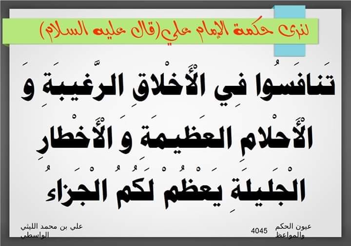 قال أمير المؤمنين عليه السلام: (تنافسوا في الأخلاق الرغيبة ، والأحكام العظيمة ، والأخطار الجليلة ، يعظم لكم الجزاء) غرر الحكم355.