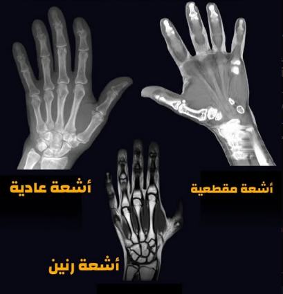 تُظهر الصورة ثلاثة أنواع من تقنيات التصوير الطبي التي تعتمد على مبادئ فيزيائية مختلفة تمامًا. الأشعة العادية تستخدم فوتونات الأشعة السينية التي تُمتص بقدر يتناسب مع كثافة المادة، لذلك تظهر العظام بوضوح بينما تبدو الأنسجة اللينة أقل تعريفًا. الأشعة المقطعية تعتمد على الدوران الكامل لمصدر الأشعة حول اليد لتكوين مقاطع طبقية عالية الدقة تكشف تفاصيل لا تراها الأشعة العادية. أما الرنين المغناطيسي فيعتمد على استجابة بروتونات الهيدروجين داخل الأنسجة عند تعريضها لمجال مغناطيسي قوي