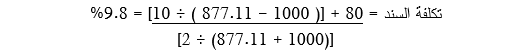بما ان الشركة باعت السند بقيمة 877.11 وﺳـﺗدﻓﻊ ﺑﺎﻟﻣﻘﺎﺑـل ﻓﺎﺋـدة ﺳـﻧويـﺔ 8% او 80 دينار بالاضافة الى سداد القيمة الاسمية والبالغة 1000 في نهاية عمر السند ، ﻓـــﺈن ﺗﻛﻠﻔـــﺔ اﻟﺳـــﻧد ﻋﻠـــﻰ الشركة 8% مضافاً اليها اﻟﻔـرق ﺑـيـن ﺳـﻌر ﺑيــﻊ اﻟﺳـﻧد وﺑـيـن اﻟﻘيـﻣـﺔ الاسمية ،ويمكن احتساب تكلفة اﻟﺳﻧد ﺣﺳب طريـﻘﺔ ﻣﻌدل اﻟﻌﺎﺋد اﻟداﺧﻠﻲ ﻛﻣﺎ يـﻠﻲ :
