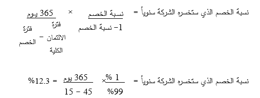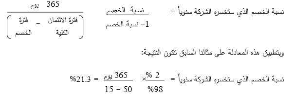 وﺑﻣـــﺎ ان ﻫـــذﻩ اﻟﻧﺳـــﺑﺔ (2.041%) تخسرها الشركة ان تأخرت في الدفع لمدة 35 يوم اضافي بعد فترة الخصم ، ﻓﻌﻧــد ﺗﺣويـــل ﻫــذﻩ اﻟﻧﺳــﺑﺔ إﻟــﻰ ﻧﺳــﺑﺔ ﺳــﻧويـﺔ ﻓــﻼ ﺑــد ﻣــن ﺿـرﺑﻬﺎ ﺑﻌــدد اﻟﻣـرات ﻓــﻲ اﻟﺳـﻧﺔ واﻟﺗــﻲ ﺗﺑﻠـﻎ 10.43 مرة في السنة (365يوم ÷ 35يوم) . اي :