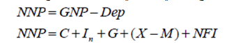 1- الناتج القومي الصافي :Net National Product(NNP)وهو عبارة عن قيمة الناتج القومي الإجمالي بعد خصم قيمة الإهتلاك Dep وهذا يعني أنه عند احتساب الناتج القومي الصافي فإننا نستخدم الاستثمار الصافي In وليس الاستثمار الإجمالي Ig وذلك لأن قيمة الإهتلاك تشير إلى انخفاض قيمة الأصول الثابتة نتيجة لعملية الإنتاج ومع مرور الوقت. وعليه يمكن حاسب قيمة الناتج القومي الصافي من خلال الصيغ التالية: