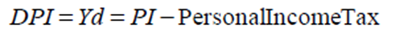 3.الدخل الشخصي المتاح Disposable Personal Income (DPI) ويقيس ما يصل إلى الفرد من الناتج القومي ولكن بعد خصم الضرائب على الدخل الشخصي. ويستخدم الدخل الشخصي المتاح لمقياس قدرة الفرد على الإنفاق على السلع والخدمات أي كمقياس للقوة الشرائيةPurchasing .Power ويحسب من خلال طرح الضريبة على الدخل الشخصي Personal Income Tax من الدخل الشخصي:Personal Income