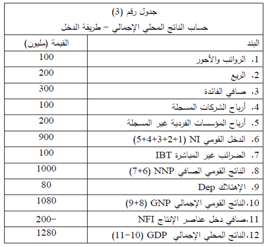 مثال ( 3): الجدول رقم ( 3) يبين كيفية حساب الناتج المحلي الإجمالي باستخدام طريقة الدخل، حيث يتم احتساب الدخل القومي NI ثم الناتج القومي الصافي NNP ومن ثم الناتج القومي الإجمالي ومن ثم تحسب قيمة الناتج المحلي الإجماليGNP