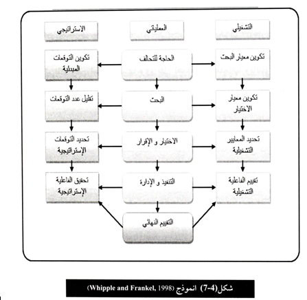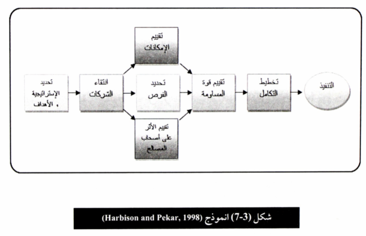 ح - التنفيذ implementation: في هذه المرحلة يتم تنفيذ التحالف وما يتخلله من اجراءات تعاونية فيما بين المنظمتين مع قياس وتقيم اداء التحالف وتحديد المشاكل ومحاولته اصلاحها في حال ظهورها، و الشكل (3 -7) يوضح انموذج (Harbison and Pekar) .