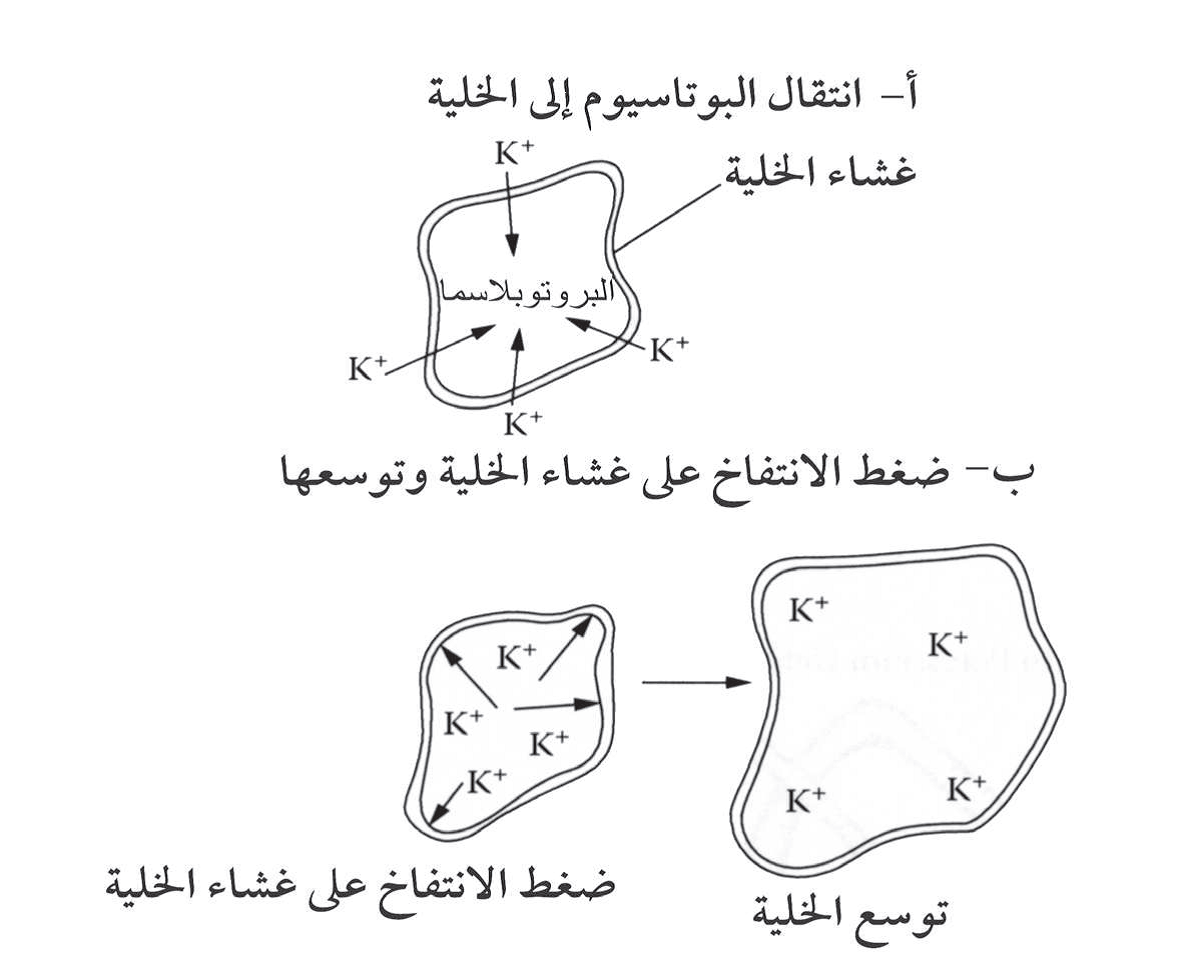 شكل يبين دور البوتاسيوم في نمو النبتة بتوسع الخلايا الناتج من أيونات البوتاسيوم ودخول الماء في الخلايا لإنتاج ضغط التورم كقوة لتوسع الخلية.
