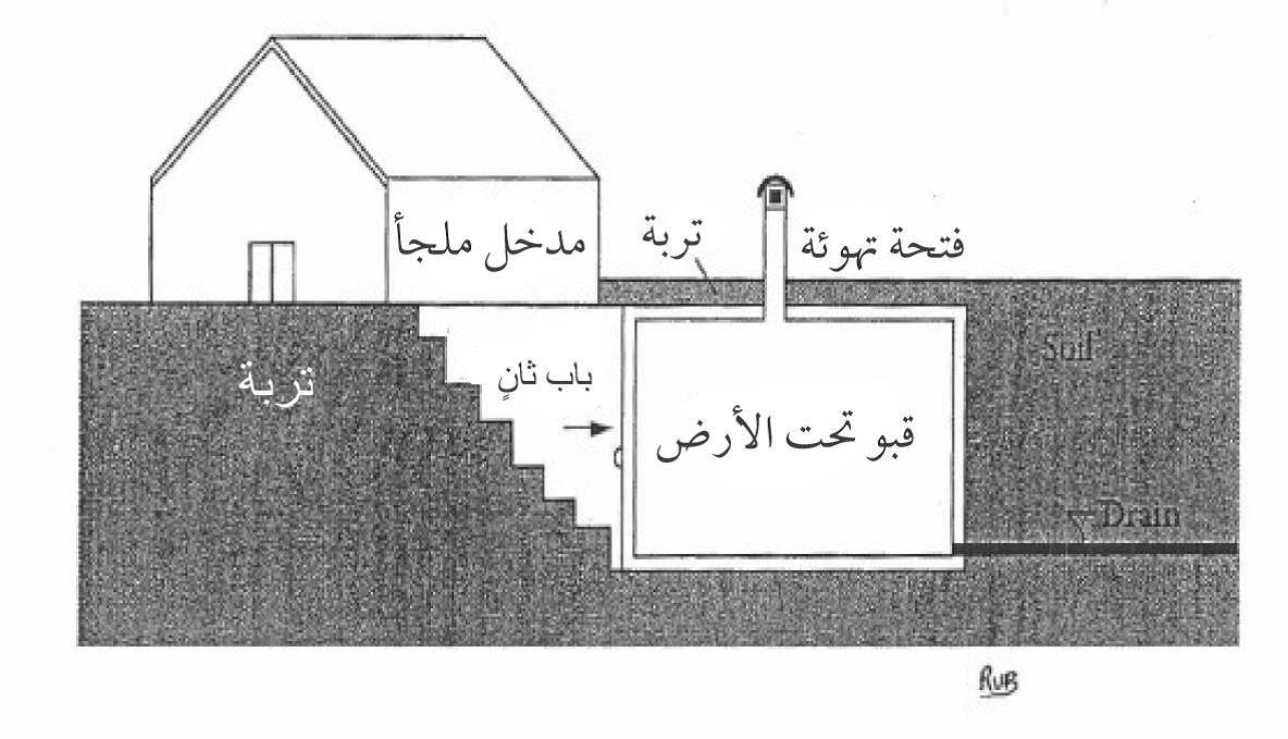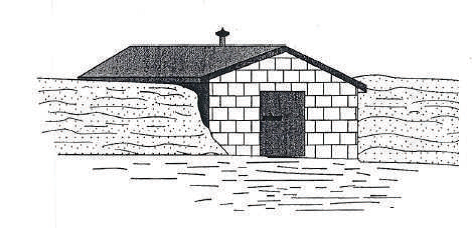 الشكل 2 تخطيط لقبو موجود جزئياً تحت الأرض مع الجدران الجانبية والخلفية المغطاة بالتربة. مع البناء الإسمنتي للسقف، يمكن تغطية القبو بالتربة، وجهة المدخل فقط معرضة بالكامل للهواء الطلق.