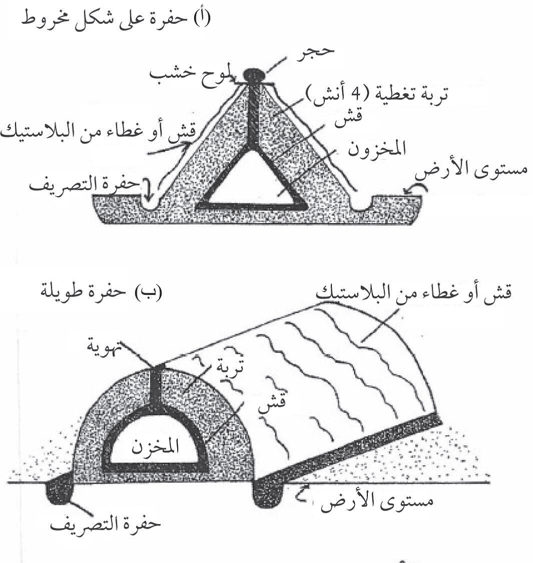 الشكل 4 تصميم (أ) حفرة بشكل مخروط (ب) حفرة طولية الشكل للتخزين الخارجي للفواكه والخضروات.