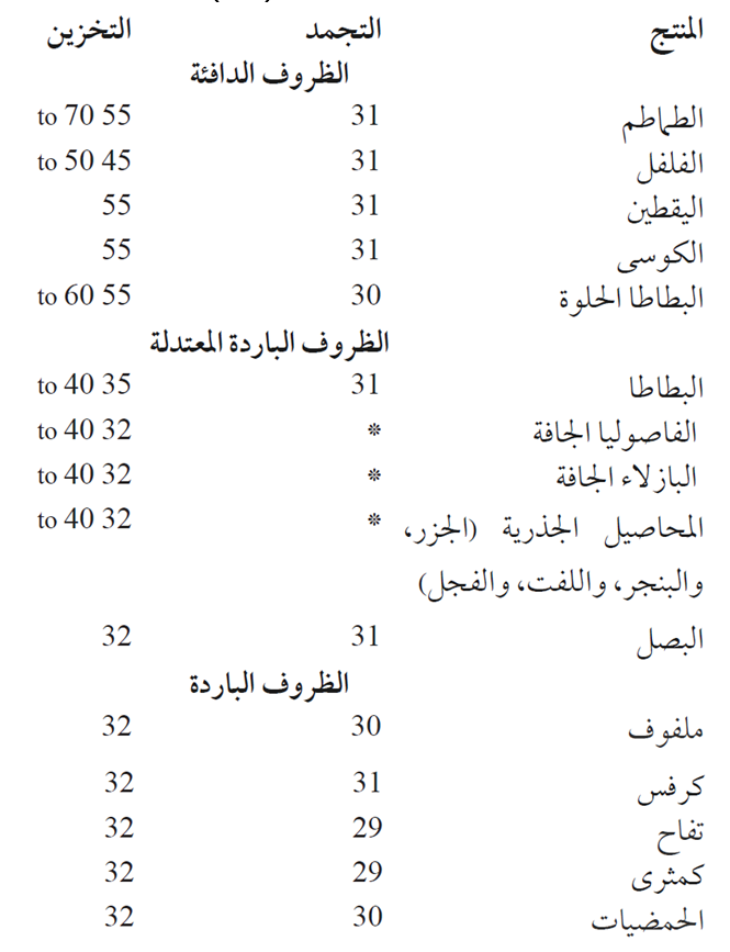 تخزن العديد من الفواكه والخضروات بشكل أفضل تحت درجة حرارة تقارب Fº 32 . ويجب أن تكون درجات الحرارة في الهواء الطلق من دون حرارة التجمد، للحفاظ على درجة الحرارة هذه في غرفة التخزين. تنفس [تعرق] المنتوجات المخزنة تبث حرارة وقد يسبب ارتفاع درجات الحرارة. تنظم درجات الحرارة في الطوابق تحت الأرض والأقبية والملحقات بفتح وإغلاق أجهزة التهوية (النوافذ أو الأبواب أو فتحات أخرى). يحتاج التحكم في درجة حرارة التخزين إلى إدارة يومية لأجهزة [مراوح] التهوية. عندما تكون درجات الحرارة الخارجية أعلى من تلك الموجودة في المخزن، ينبغي إبقاء أجهزة التهوية مغلقة كي لا تدخل الحرارة إلى المخزن. عندما تكون درجات الحرارة الخارجية أقل بقليل أو بشكل متوسط من تلك التي في المخزن، يجب فتح أجهزة التهوية للسماح بتبادل الهواء الخارجي البارد مع الهواء الحار في المخزن. وينبغي إغلاق أجهزة التهوية عندما تكون درجات الحرارة الخارجية أقل من حرارة التجمد. إن التهوية المفرطة لغرفة التخزين في الطقس البارد تحت درجة التجمد خطر، فقد يتسبب بتجمد المنتوجات المخزنة. سوف يدمر التجمد القدرة التخزينية لمعظم الفواكه والخضروات. لا تتضرر الفاصوليا والبازلاء المجففة ومعظم المحاصيل الجذرية بالتجمد، إلا إذا كانت درجات الحرارة أقل من حرارة التجمد بكثير ولمدة طويلة. إن تكرار الانتقال بين حالة التجمد وحالة ذوبان الجليد لهذه المحاصيل سيتسبب بتلفها. يستخدم التجمد القاسي للفول أو البازلاء المجففة غالباً لقتل السوس الذي قد يصيب البذور خلال التخزين. درجات الحرارة القريبة للتجمد ودرجات الحرارة الموصى بها لتخزين بعض الفواكه والخضروات مُجَدوَلة في الجدول 1. الرياح القوية تسرع معدلات التهوية وترفع إمكانية تجمد المنتوجات المخزنة. عموماً، في مرفق تخزين معزول حرارياً، يمكن أن تنخفض درجات الحرارة في الخارج إلى مستوى أقل من 10 درجات فهرنهايت قبل أن تنخفض درجات الحرارة في المخزن إلى أقل من ºF 30 . ستكون هناك حاجة للتهوية المتقطعة في المخزن عندما تكون درجات الحرارة في الخارج نحو 10 إلى Fº 20 . ستكون هناك حاجة لتهوية مستمرة عندما تكون درجات الحرارة في الخارج نحو 20 إلى Fº 32 . فوق Fº 32 ، ستكون هناك حاجة للتهوية فقط إذا كانت درجة الحرارة في الخارج أبرد من درجة حرارة الداخل.