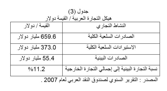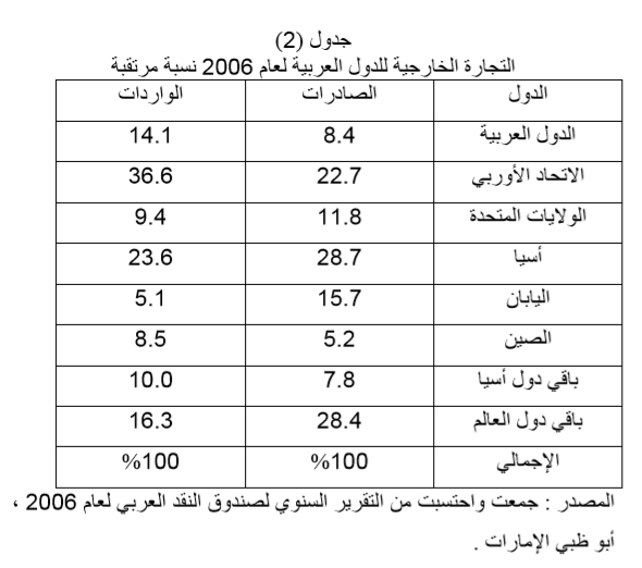 أن اﻟﺪول اﻟﻌﺮﺑﻴﺔ ﻻ ﺗﻮاﺟﻪ ﺟﻤﻴﻌًﺎ ﻧﻔﺲ اﻟﺘﺤﺪﻳﺎت الاقـﺘﺼﺎدﻳﺔ ﺑﺴﺒﺐ اﺧﺘﻼﻓﻬﺎ ﻣﻦ ﻧﺎﺣﻴﺔ اﻟﻤﻮارد اﻷوﻟﻴﺔ واﻟﻬﻴﻜﻞ اﻻﻗﺘﺼﺎدي وﻣﺴﺘﻮى اﻟﺘﻨﻤﻴﺔ واﺧﺘﻼف اﻷﻧﻈﻤﺔ اﻟﻤﺎﻟﻴﺔ وإدارة اﻟﻨﻈﺎم اﻟﻤﺎﻟﻲ اﻟﻤﺤﻠﻲ هـﻲ ﻣﻦ اﻟﺘﺤﺪﻳﺎت اﻟﻜﺒﺮى اﻟﺘﻲ ﺗﻮاﺟﻪ ﺻﺎﻧﻌﻲ اﻟﺴﻴﺎﺳﺎت ﻓﻲ اﻟﺪول اﻟﻌﺮﺑﻴﺔ واﻷداء اﻟﻤﺎﻟﻲ ﻳﺆﺛﺮ ﺣﺘﻤًﺎ ﻋﻠﻰ اﻷداء اﻻﻗﺘﺼﺎدي ﻓﻲ اﻷﻣﺪ اﻟﻄﻮﻳﻞ ، وﻋﻠﻰ اﻻﺳﺘﻘﺮار اﻻﻗﺘﺼﺎدي اﻟﻜﻠﻲ ﻓﻲ اﻟﻤﺪى اﻟﻘﺼﻴﺮ ، واﻟﺤﻘﻴﻘﺔ أن اﻟﻤﺆﺷﺮات اﻻﻗﺘﺼﺎدﻳﺔ اﻟﻮاردة ﻓﻲ اﻟﺠﺪول (2) ﺗﺒﻴﻦ أن ﺣﺠﻢ ﻗﻮة ﺗﺮاﺑﻂ اﻗﺘﺼﺎدﻳﺎت اﻟﺪول اﻟﻌﺮﺑﻴﺔ ﻣﻊ اﻻﻗﺘﺼﺎد اﻟﻌﺎﻟﻤﻲ ، ﺣﻴﺚ أن اﻟﻨﺸﺎط اﻟﺘﺼﺪﻳﺮي ﻟﻠﺪول اﻟﻌﺮﺑﻴﺔ إﻟﻰ ﻣﺠﻤﻮﻋﺔ اﻟﺪول اﻷورﺑﻴﺔ ﺑﻠﻐﺖ ﻧﺴﺒﺘﻪ ﻓﻲ ﻋﺎم 2006 ﺣﻮاﻟﻲ (22.7%) وإﻟﻰ اﻟﻮﻻﻳﺎت اﻟﻤﺘﺤﺪة 11.8% وإﻟﻰ ﻣﺠﻤﻮﻋﺔ دول أﺳﻴﺎ 28.7 % وإﻟﻰ اﻟﻴﺎﺑﺎن 15.7% وإﻟﻰ ﺑﺎﻗﻲ دول اﻟﻌﺎﻟﻢ 28.4% ﻓﻲ ﺣﻴﻦ ﺑﻠﻐﺖ ﻧﺴﺒﺔ اﺳﺘﻴﺮادات ﻣﺠﻤﻮﻋﺔ اﻟﺪول اﻟﻌﺮﺑﻴﺔ ﻣﻦ اﻟﻌﺎﻟﻢ اﻷورﺑﻲ ﺑﺤﺪود 36.6% وﻣﻦ دول أﺳﻴﺎ 23.6% وﻣﻦ ﺑﺎﻗﻲ دول اﻟﻌﺎﻟﻢ 16.35% ، وﻧﺴﺘﻄﻴﻊ أن ﻧﻌﻜﺲ ﻗﻮة ﺗﺮاﺑﻂ اﻻﻗﺘﺼﺎدات اﻟﻌﺮﺑﻴﺔ ﻣﻊ اﻟﻌﺎﻟﻢ ﻣﻦ ﺧﻼل اﻟﻘﻴﻤﺔ اﻟﻤﻄﻠﻘﺔ ﻟﺤﺠﻢ هـﻴﻜﻞ اﻟﺘﺒﺎدل اﻟﺘﺠﺎري اﻟﺨﺎرﺟﻲ ، اذ يبين الجدول (3) أن ﺻﺎدرات اﻟﺪول اﻟﻌﺮﺑﻴﺔ اﻟﻜﻠﻴﺔ (اﻟﺴﻠﻌﻴﺔ) ﺑﻠﻐﺖ ﻗﻴﻤﺘﻬﺎ ﻓﻲ ﻋﺎم (2006) ﺣﻮاﻟﻲ (659.6) ﻣﻠﻴﺎر دوﻻر ، ﻓﻲ ﺣﻴﻦ اﻟﻮاردات اﻟﺴﻠﻌﻴﺔ اﻟﻜﻠﻴﺔ ﻟﻬﺬﻩ الدول ﻣﻦ دول اﻟﻌﺎﻟﻢ ﺑﻠﻐﺖ (373.0) ﻣﻠﻴﺎر دوﻻر ، ﻓﻲ ﺣﻴﻦ ﺣﺠﻢ اﻟﺼﺎدرات اﻟﺒﻴﻨﻴﺔ ﺑﻠﻐﺖ أﻗﻞ ﻗﻴﻤﺔ ﻟﻬﺎ ﺗﻘﺪر ﺑﺤﺪود (55.4) ﻣﻠﻴﺎر دوﻻر وهـﻲ ﺗﺸﻜﻞ ﻧﺴﺒﺔ ﺿﺌﻴﻠﺔ ﻓﻲ ﺣﺠﻢ اﻟﺘﺒﺎدل اﻟﺘﺠﺎري ﺣﻴﺚ ﺑﻠﻐﺖ ﻧﺴﺒﺘﻬﺎ إﻟﻰ إﺟﻤﺎﻟﻲ اﻟﺘﺠﺎرة اﻟﺨﺎرﺟﻴﺔ 11.2% (2) .