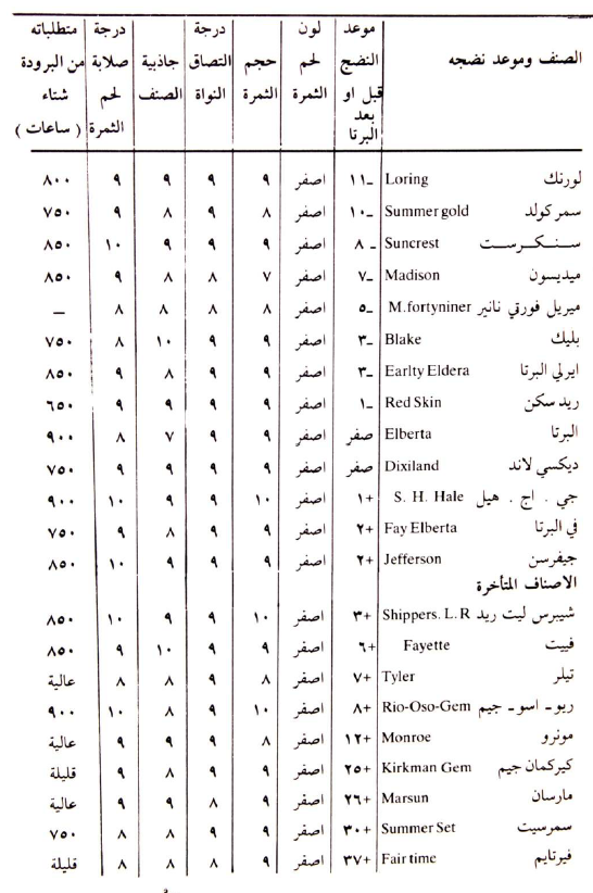 جدول يبين اهم أصناف الخوخ المنتشرة زراعتها في امريكا الشمالية مرتبة حسب موعد نضجها وبعض صفاتها الأخرى. أن الأرقام من 1 - 10 في الجدول تدل على أنه كلما كانت القيمة اعلى كلما كانت الصفة مرغوبة اكثر ( اقتبست من N. F. Childers 1973).