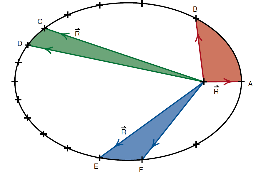Figure 1: Kepler’s Second Law. The radius vectorR should sweep out equal areas in equal time.