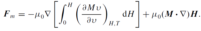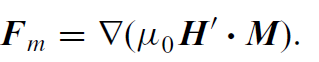 This is known as the Kelvin force. When M is parallel to the z-direction and the change in H' is also in the z-direction, the expression is Fz = μ0M(∂H'/∂z). In any case, the force is always in the direction of the gradient of the magnitude of the applied field. A general expression for the force density when M is not independent of H is
