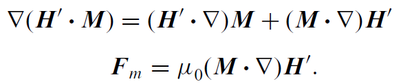 Using an identity for ∇(A · B) (Appendix C), the expression takes a simpler formwhen M is uniformand independent of H (∇ × M = 0), and no currents are present (∇ × H' = 0). The first term on the right is zero because the curl is zero: