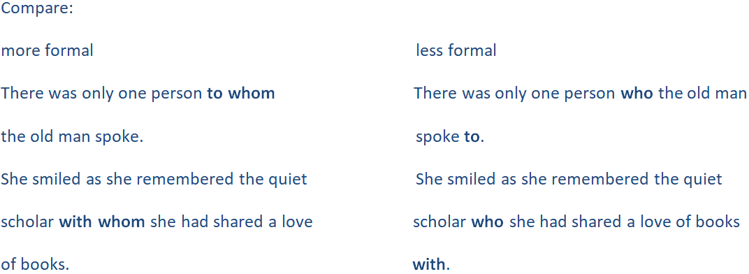 We can put the preposition immediately before the relative pronoun (more formal) or at the end of the relative clause (more informal).